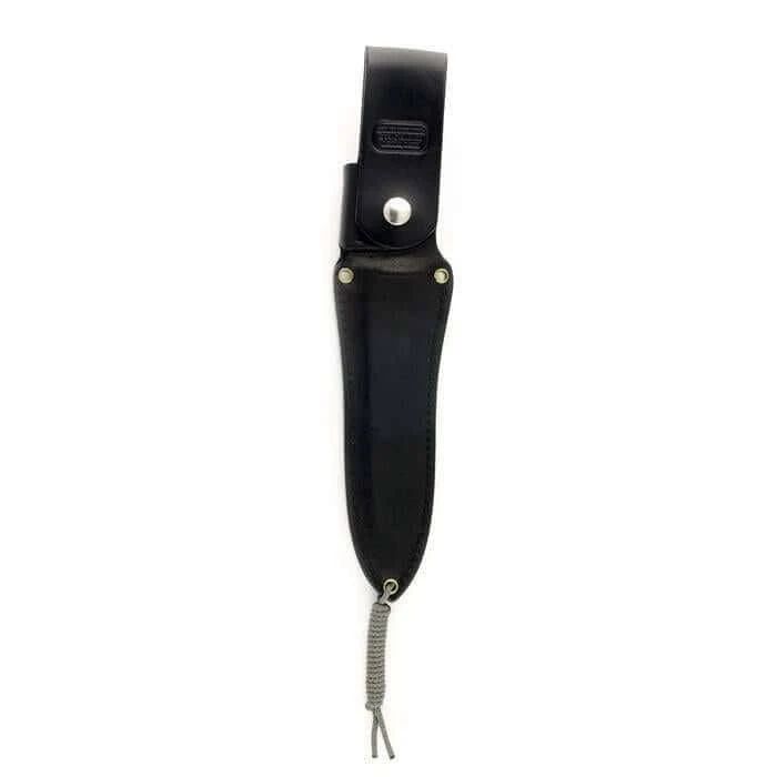 Keep your Green Beret or Pacific looking sharp while tucked away snug in a leather sheath. Featuring a simple snap to hold onto your belt and paracord for emergencies. Each sheath is carefully carved and sewn by the seasoned leather craftsmen at G’feller Casemakers. Left or right hand oriented.
