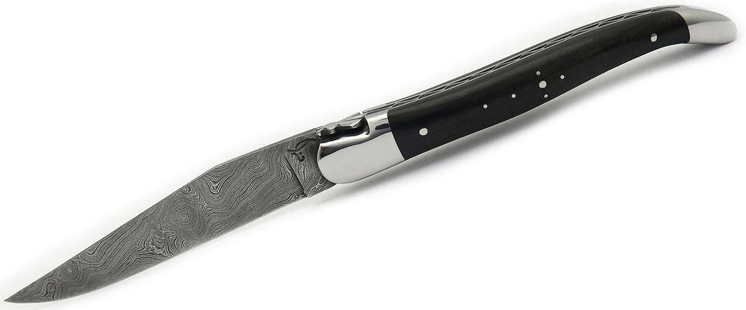 The LD6KE folder features African ebony wood and Damascus steel. The Damascus steel is produced in-house at the Laguiole HonorΓ© Durand factory.