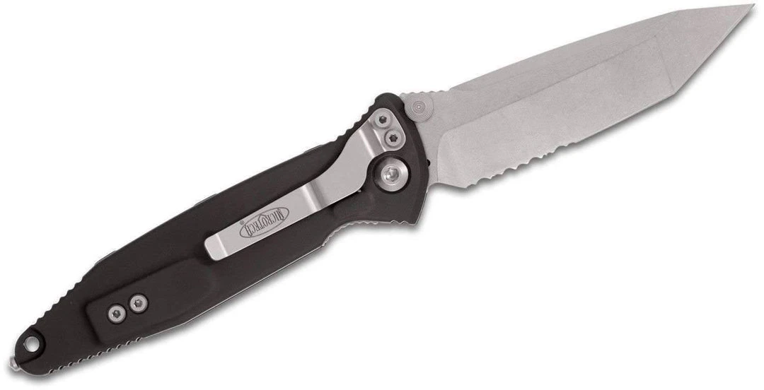 This Socom Elite manual folding knife has a black aluminum handle and a partially serrated, stonewashed tanto blade. Since the creation of the original, the Microtech Socom has been setting the standard for tactical/utility cutlery. The Socom Elite builds on this design to adapt to a variety of different environments. Its handle sports grip inserts and a unique shape that molds to your hand for a comfortable and secure grip at all times. Features: Lightweight, ergonomic aluminum handle with grip-enhancing inserts. Secure tip-down pocket clip, lanyard hole, and glass breaker tip. Bohler M390/204P blade with dual thumb studs for easy one-handed deployment