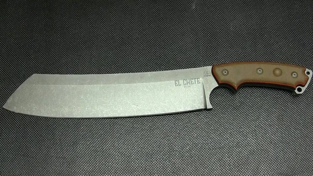 El Chete is the first TOPS knife to be released with our wicked new finish called Acid Rain. Because of the process we use, the finish varies slightly from knife to knife so that each person gets something unique. We wanted the handles to be thick enough to fill each user’s hand like a hatchet or small ax handle would, so we decided to use sandwiched Micarta. It’s well rounded for comfort and the black canvas Micarta underneath the green canvas Micarta adds even more to the aesthetics of this piece.