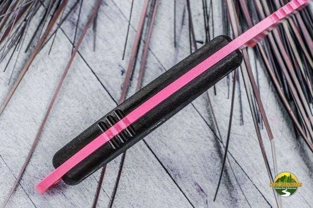 The contour of the cutting blade, combined with finger tread, enables both small and delicate chores to be completed with relative ease. Sleek handle ergonomics make long activities much easier to complete. The Lioness is complemented with the simple beauty of a quality leather sheath that can attach to a belt, pack, bag, purse (or almost anything) with a strap and snap closure. Hot pink and black leather paired as only TOPS can do it.